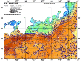04月16日発表1 黒潮は、室戸岬〜潮岬で接岸し、熊野灘〜石廊埼沖を東進した後、北上して御蔵島を通過し、犬吠埼沖から北東へ流去している。